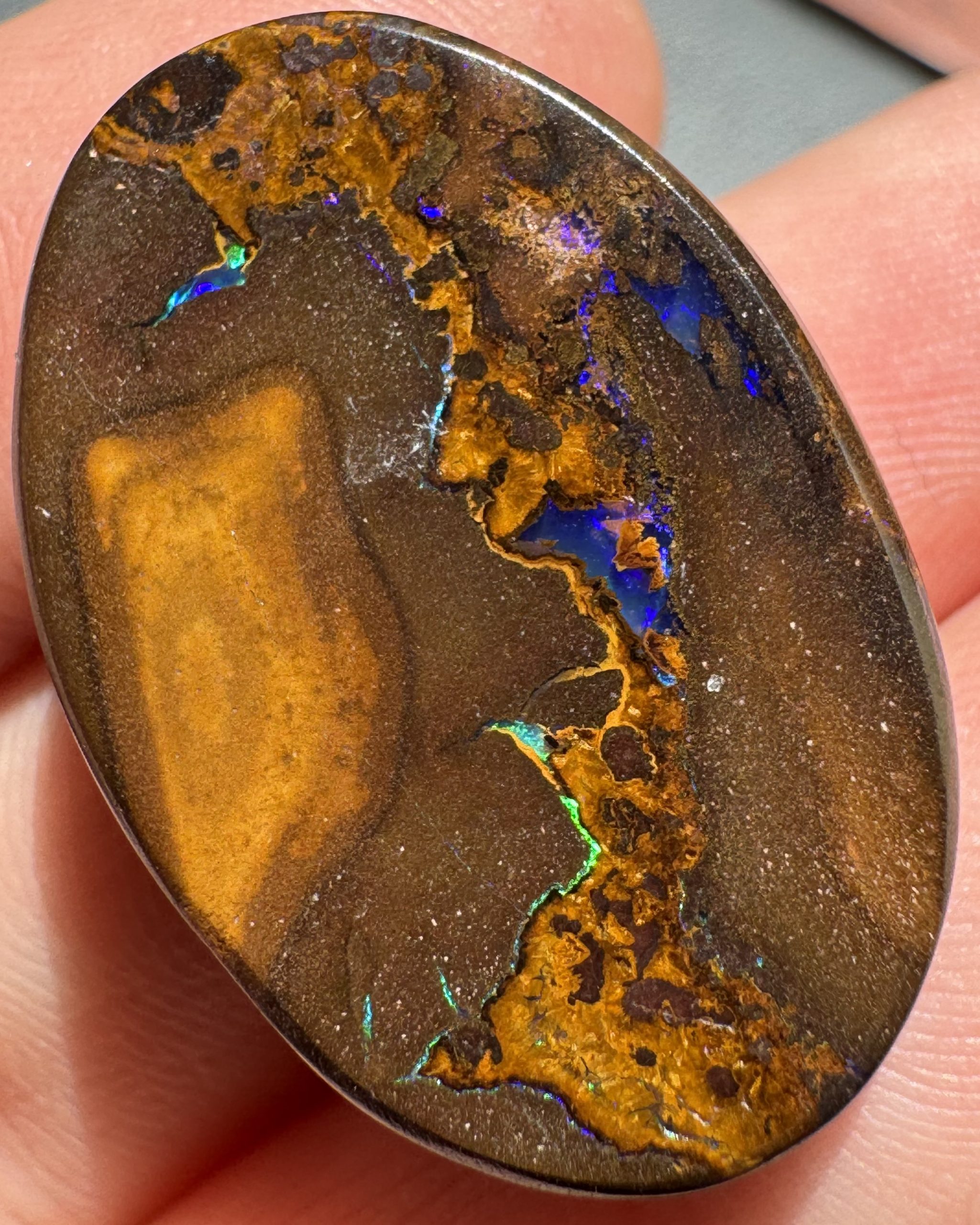 Boulder Opal Blues with white fangs 43mm x 30mm x 8mm thick .57oz IMG8782