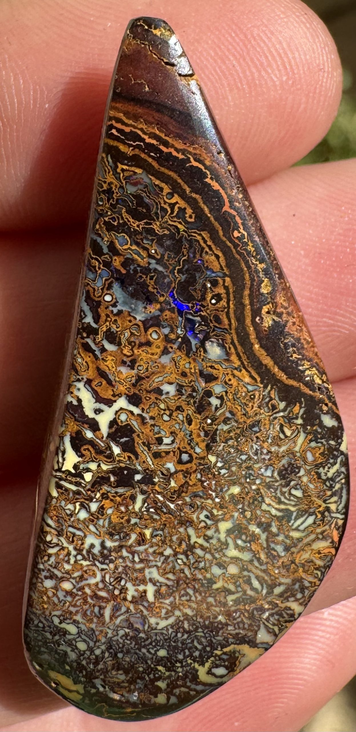Boulder Opal Blues with white fangs 43mm x 30mm x 8mm thick .57oz IMG8782